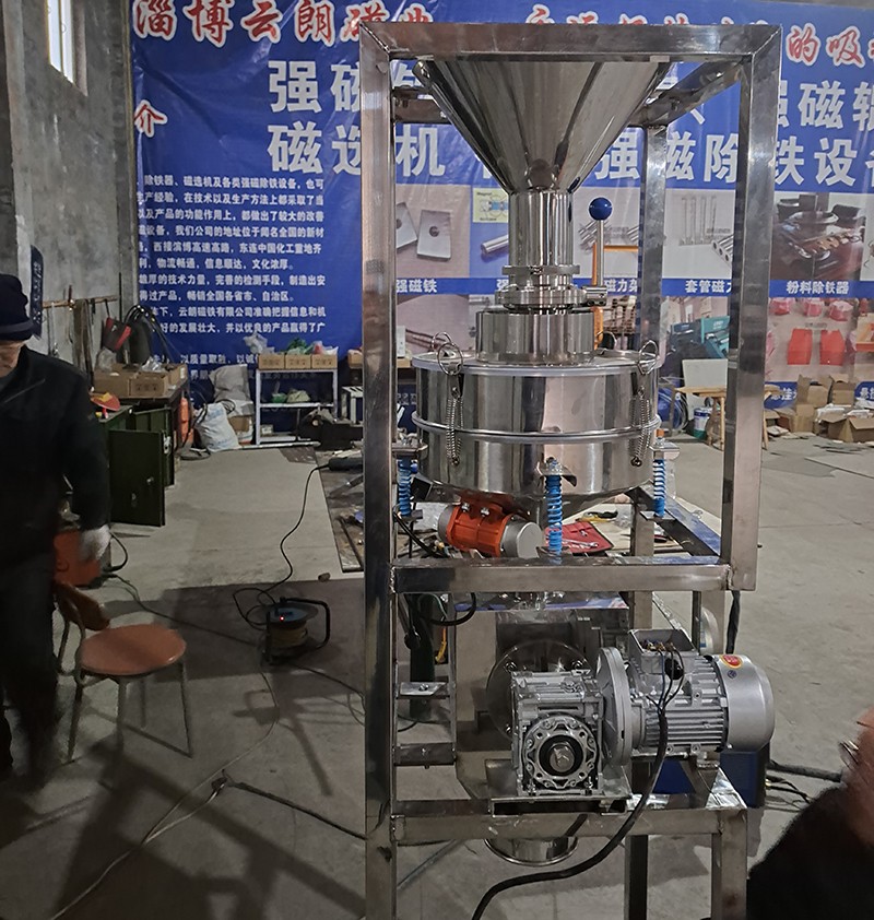 其原理为:当含铁的物质通过时,受到强磁场的吸引力,将含铁的物质牢固的吸附在管壁上,达到保证设备的不受铁杂质的损伤和产品的安全,可以大大降低成品物料中的含铁量。